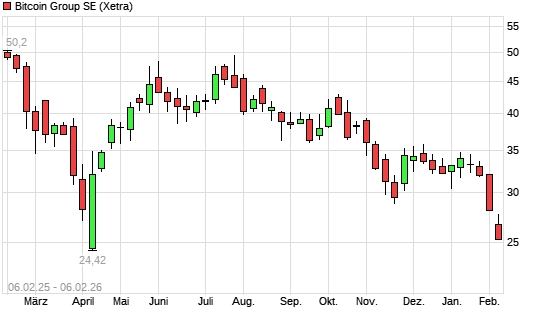 Bitcoin Group ist Teil des 334 Titel umfassenden Anlageuniversum des boerse.de-Signale Aktien DACH. In der großen Trendauswertung vom 06.02.2026 ist der Titel von Rang 313 auf Rang 310 aufgestiegen.Gesteuert ...weiterlesen