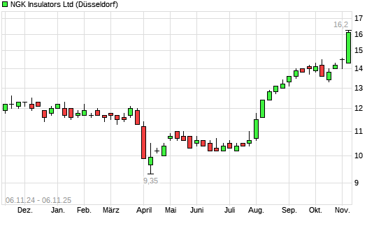 Mit dem Anstieg auf 15,60 EUR hat die NGK Insulators-Aktie (ISIN JP3695200000) am 05.11.2025 ein neues 3-Jahres-Hoch erreicht und damit den Kurs vom 04.11.2025 eingestellt.Die NGK Insulators-Aktie ...weiterlesen