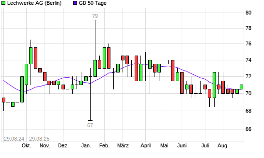 Mit dem Anstieg auf 70,50 EUR hat die Lechwerke-Aktie am 28.08.2025 die 50-Tage-Linie nach oben gekreuzt.Die Lechwerke-Aktie befindet sich seit dem 22.07.2025 im langfristigen Abwärtstrend und ...weiterlesen