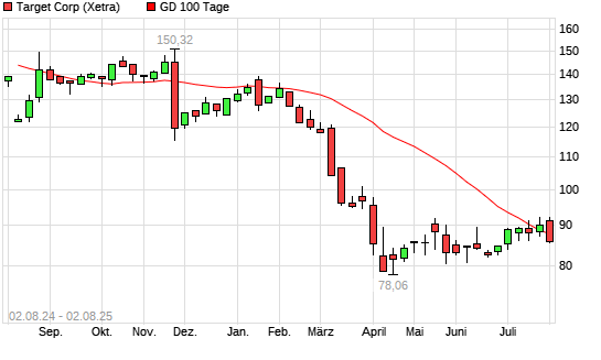 Mit dem Rücksetzer auf 85,60 EUR hat die Target-Aktie am 01.08.2025 die 100-Tage-Linie nach unten gekreuzt.Die Target-Aktie befindet sich seit dem 20.11.2024 im langfristigen Abwärtstrend ...weiterlesen