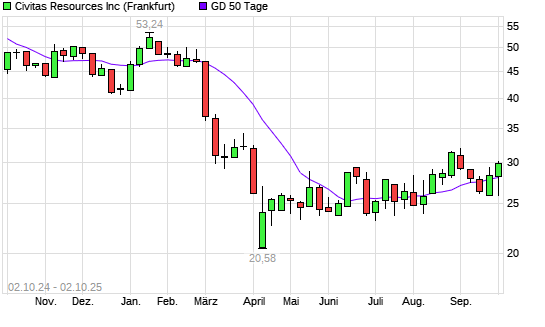 Mit dem Anstieg auf 30,01 EUR hat die Bonanza Creek Energy-Aktie am 01.10.2025 die 50-Tage-Linie nach oben gekreuzt.Der Abstand zur 200-Tage-Linie beträgt aktuell -5,85%.