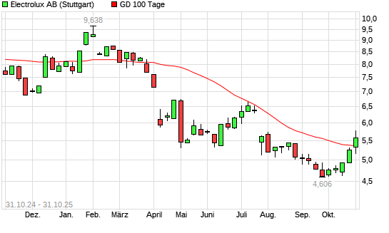 Mit dem Anstieg auf 6,10 EUR hat die Electrolux B-Aktie am 30.10.2025 die 100-Tage-Linie nach oben gekreuzt.Die Electrolux B-Aktie befindet sich seit dem 21.03.2025 im langfristigen Abwärtstrend ...weiterlesen