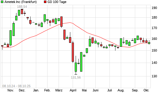 Mit dem Rücksetzer auf 155,50 EUR hat die Ametek-Aktie am 07.10.2025 die 100-Tage-Linie nach unten gekreuzt.Die Ametek-Aktie befindet sich seit dem 15.09.2025 im langfristigen Abwärtstrend ...weiterlesen