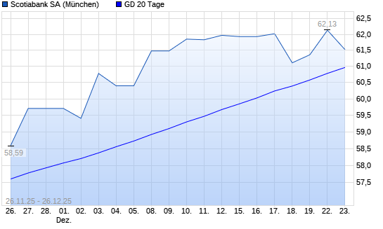 Mit dem Rücksetzer auf 60,90 EUR hat die Bank of Nova Scotia-Aktie am 25.12.2025 die 20-Tage-Linie nach unten gekreuzt.Die Bank of Nova Scotia-Aktie befindet sich seit dem 22.07.2025 im ...weiterlesen