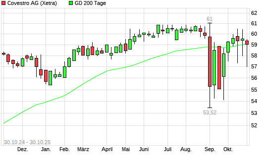 Mit dem Rücksetzer auf 58,10 EUR hat die Covestro-Aktie am 29.10.2025 die 200-Tage-Linie nach unten gekreuzt.Die Covestro-Aktie befand sich seit dem 01.10.2025 im langfristigen Aufwärtstrend ...weiterlesen