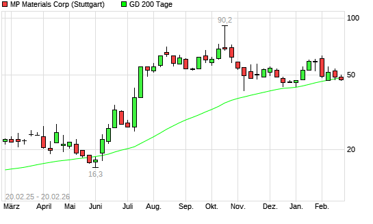 Mit dem Rücksetzer auf 48,50 EUR hat die MP Materials-Aktie am 19.02.2026 die 200-Tage-Linie nach unten gekreuzt.Die MP Materials-Aktie befand sich seit dem 18.02.2026 ...weiterlesen