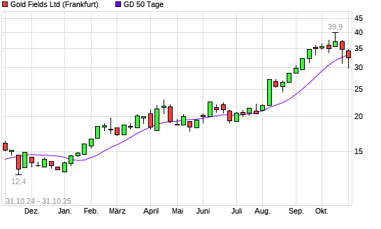 Mit dem Anstieg auf 33,90 EUR hat die Gold Fields-Aktie am 30.10.2025 die 50-Tage-Linie nach oben gekreuzt.Die Gold Fields-Aktie befindet sich seit dem 09.01.2025 im langfristigen Aufwärtstrend ...weiterlesen