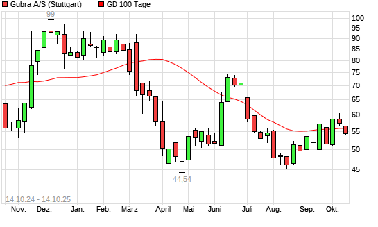 Mit dem Rücksetzer auf 55,30 EUR hat die Gubra-Aktie am 13.10.2025 die 100-Tage-Linie nach unten gekreuzt.Die Gubra-Aktie befindet sich seit dem 30.06.2025 im langfristigen Abwärtstrend ...weiterlesen