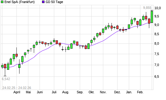 Mit dem Anstieg auf 9,68 EUR hat die Enel-Aktie am 23.02.2026 die 50-Tage-Linie nach oben gekreuzt.Die Enel-Aktie befindet sich seit dem 09.04.2025 im langfristigen Aufwärtstrend und ...weiterlesen