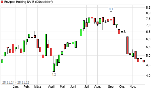 Mit dem Rücksetzer auf 4,53 EUR hat die Envipco Holding-Aktie (ISIN NL0015000GX8) am 24.11.2025 ein neues 6-Monats-Tief erreicht und damit den Kurs vom 12.11.2025 eingestellt.Die Envipco ...weiterlesen
