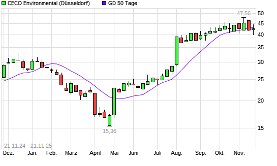 Mit dem Rücksetzer auf 42,60 EUR hat die CECO Environmental-Aktie am 20.11.2025 die 50-Tage-Linie nach unten gekreuzt.Die CECO Environmental-Aktie befindet sich seit dem 04.07.2025 im langfristigen ...weiterlesen