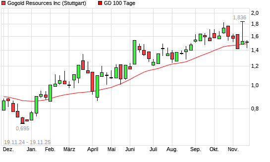 Mit dem Rücksetzer auf 1,43 EUR hat die GoGold Resources-Aktie am 18.11.2025 die 100-Tage-Linie nach unten gekreuzt.Die GoGold Resources-Aktie befindet sich seit dem 10.04.2025 im langfristigen ...weiterlesen