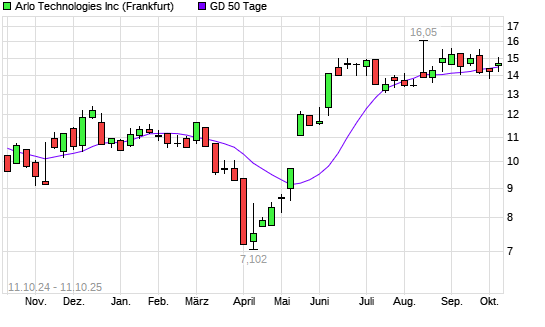 Mit dem Anstieg auf 14,85 EUR hat die Arlo Technologies-Aktie am 10.10.2025 die 50-Tage-Linie nach oben gekreuzt.Die Arlo Technologies-Aktie befindet sich seit dem 12.05.2025 im langfristigen ...weiterlesen