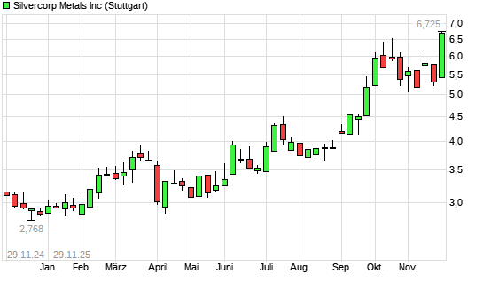 Mit dem Anstieg auf 6,78 EUR hat die Silvercorp Metals-Aktie (ISIN CA82835P1036) am 28.11.2025 ein neues 5-Jahres-Hoch erreicht und damit den Kurs vom 16.10.2025 eingestellt.Der Abstand ...weiterlesen