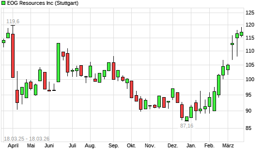 Mit dem Anstieg auf 117,44 EUR hat die EOG Resources-Aktie (ISIN US26875P1012) am 17.03.2026 ein neues 6-Monats-Hoch erreicht und damit den Kurs vom 16.03.2026 eingestellt.Die ...weiterlesen