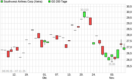 Mit dem Anstieg auf 28,07 EUR hat die Southwest Airlines-Aktie am 10.11.2025 die 200-Tage-Linie nach oben gekreuzt.Die Southwest Airlines-Aktie befand sich seit dem 24.10.2025 im langfristigen ...weiterlesen
