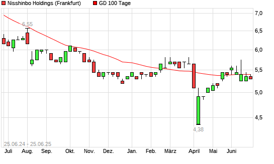 Mit dem Anstieg auf 5,40 EUR hat die Nisshinbo Holdings-Aktie am 24.06.2025 die 100-Tage-Linie nach oben gekreuzt.Die Nisshinbo Holdings-Aktie befindet sich seit dem 12.06.2025 im langfristigen ...weiterlesen
