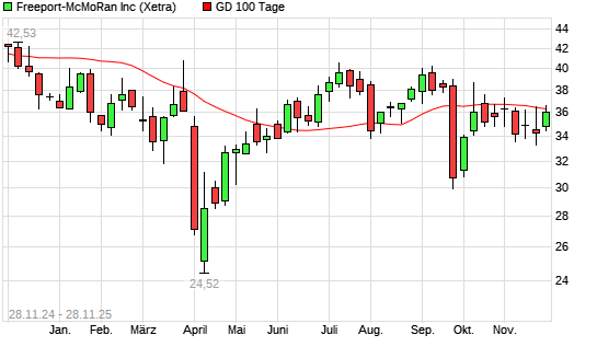 Mit dem Anstieg auf 36,37 EUR hat die Freeport-McMoran Copper-Aktie am 27.11.2025 die 100-Tage-Linie nach oben gekreuzt.Die Freeport-McMoran Copper-Aktie befindet sich seit dem 25.11.2025 im ...weiterlesen