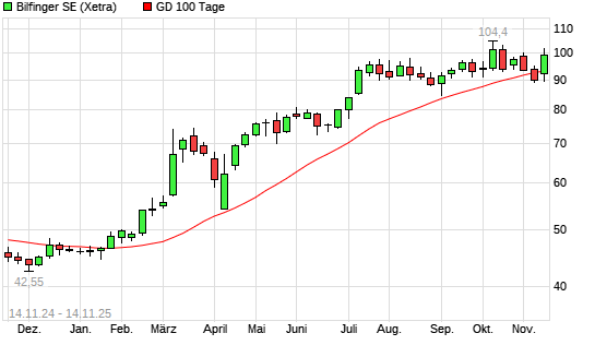 Mit dem Anstieg auf 98,65 EUR hat die Bilfinger-Aktie am 13.11.2025 die 100-Tage-Linie nach oben gekreuzt.Die Bilfinger-Aktie befindet sich seit dem 22.01.2025 im langfristigen Aufwärtstrend ...weiterlesen