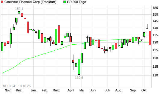 Mit dem Rücksetzer auf 128,40 EUR hat die Cincinnati Financial-Aktie am 17.10.2025 die 200-Tage-Linie nach unten gekreuzt.Die Cincinnati Financial-Aktie befand sich seit dem 18.09.2025 ...weiterlesen