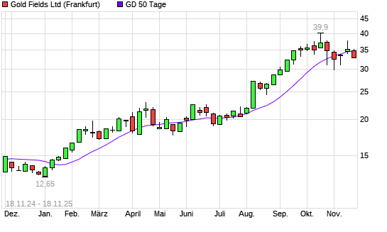 Mit dem Rücksetzer auf 33,50 EUR hat die Gold Fields-Aktie am 17.11.2025 die 50-Tage-Linie nach unten gekreuzt.Die Gold Fields-Aktie befindet sich seit dem 09.01.2025 im langfristigen Aufwärtstrend ...weiterlesen