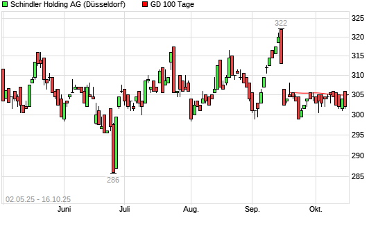 Mit dem Anstieg auf 304,50 EUR hat die Schindler Holding N-Aktie am 15.10.2025 die 100-Tage-Linie nach oben gekreuzt.Der Abstand zur 200-Tage-Linie beträgt aktuell +3,46%. ...weiterlesen