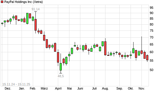 Mit dem Rücksetzer auf 54,00 EUR hat die PayPal-Aktie (ISIN US70450Y1038) am 14.11.2025 ein neues 6-Monats-Tief erreicht und damit den Kurs vom 10.09.2025 eingestellt.Die PayPal-Aktie befindet ...weiterlesen