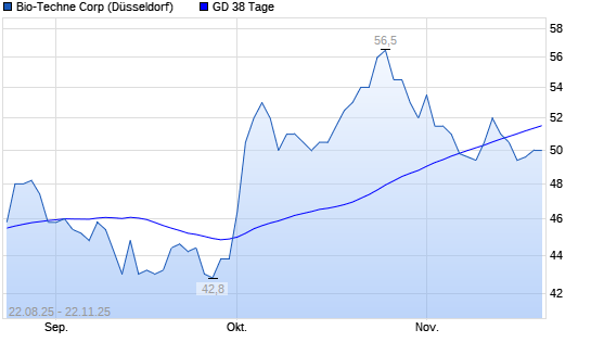 Mit dem Anstieg auf 53,00 EUR hat die Bio-Techne-Aktie am 21.11.2025 die 38-Tage-Linie nach oben gekreuzt.Die Bio-Techne-Aktie befindet sich seit dem 13.10.2025 im langfristigen Aufwärtstrend ...weiterlesen