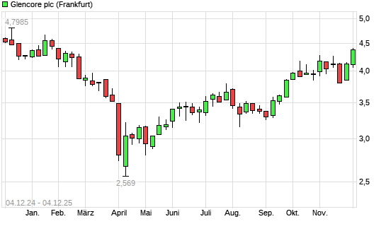 Mit dem Anstieg auf 4,38 EUR hat die Glencore-Aktie (ISIN JE00B4T3BW64) am 03.12.2025 ein neues 6-Monats-Hoch erreicht und damit den Kurs vom 29.10.2025 eingestellt.Die Glencore-Aktie befindet ...weiterlesen