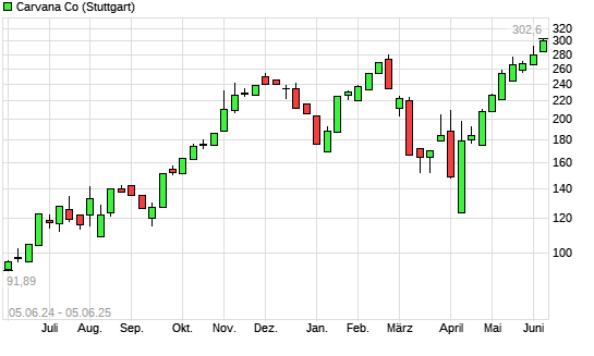 Mit dem Anstieg auf 303,30 EUR hat die Carvana Co.-Aktie (ISIN US1468691027) am 04.06.2025 ein neues 3-Jahres-Hoch erreicht und damit den Kurs vom 03.06.2025 eingestellt.Die Carvana Co.-Aktie ...weiterlesen