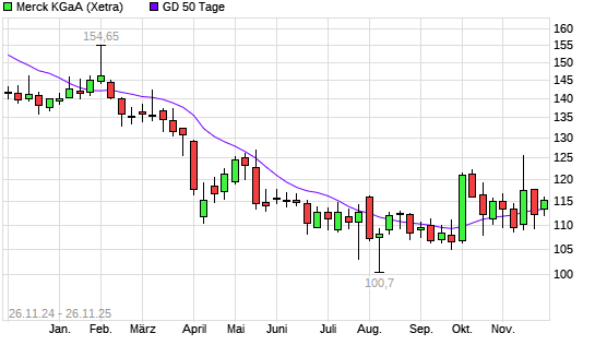 Mit dem Anstieg auf 115,55 EUR hat die Merck-Aktie am 25.11.2025 die 50-Tage-Linie nach oben gekreuzt.Die Merck-Aktie befindet sich seit dem 17.11.2025 im langfristigen Abwärtstrend und hat ...weiterlesen