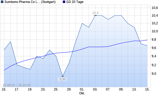 Mit dem Rücksetzer auf 9,65 EUR hat die Dainippon Sumitomo Pharma-Aktie am 14.10.2025 die 20-Tage-Linie nach unten gekreuzt.Die Dainippon Sumitomo Pharma-Aktie befindet sich seit dem 17.04.2025 ...weiterlesen