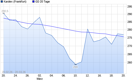 Mit dem Anstieg auf 277,50 EUR hat die Kardex-Aktie am 19.03.2026 die 20-Tage-Linie nach oben gekreuzt.Die Kardex-Aktie befindet sich seit dem 28.01.2026 im langfristigen Abwärtstrend ...weiterlesen