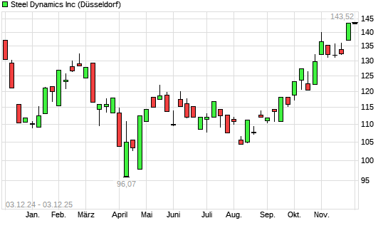 Mit dem Anstieg auf 143,18 EUR hat die Steel Dynamics-Aktie (ISIN US8581191009) am 02.12.2025 ein neues 12-Monats-Hoch erreicht und damit den Kurs vom 28.11.2025 eingestellt.Die Steel Dynamics-Aktie ...weiterlesen