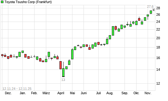 Mit dem Anstieg auf 27,60 EUR hat die Toyota Tsusho-Aktie (ISIN JP3635000007) am 11.11.2025 ein neues All-Time-High erreicht und damit den Kurs vom 10.11.2025 eingestellt.Die Toyota Tsusho-Aktie ...weiterlesen