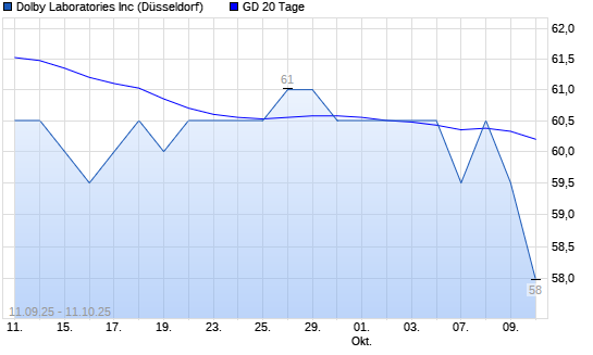Mit dem Rücksetzer auf 60,50 EUR hat die Dolby-Aktie am 10.10.2025 die 20-Tage-Linie nach unten gekreuzt.Die Dolby-Aktie befindet sich seit dem 03.04.2025 im langfristigen Abwärtstrend ...weiterlesen