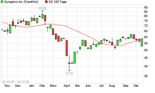 Mit dem Anstieg auf 56,66 EUR hat die Synaptics-Aktie am 15.10.2025 die 100-Tage-Linie nach oben gekreuzt.Die Synaptics-Aktie befindet sich seit dem 25.09.2025 im langfristigen Abwärtstrend ...weiterlesen