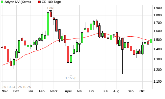 Mit dem Anstieg auf 1.507,60 EUR hat die Adyen-Aktie am 24.10.2025 die 100-Tage-Linie nach oben gekreuzt.Die Adyen-Aktie befindet sich seit dem 09.10.2025 im langfristigen Abwärtstrend und hat ...weiterlesen