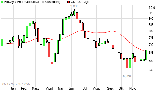 Mit dem Anstieg auf 6,61 EUR hat die Biocryst Pharmaceuticals-Aktie am 04.12.2025 die 100-Tage-Linie nach oben gekreuzt.Die Biocryst Pharmaceuticals-Aktie befindet sich seit dem 01.07.2025 im ...weiterlesen
