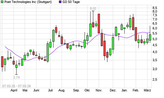 Mit dem Rücksetzer auf 5,35 EUR hat die Poet Technologies-Aktie am 06.03.2026 die 50-Tage-Linie nach unten gekreuzt.Die Poet Technologies-Aktie befindet sich seit dem 02.03.2026 ...weiterlesen