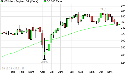 Mit dem Anstieg auf 353,90 EUR hat die MTU Aero Engines-Aktie am 27.11.2025 die 200-Tage-Linie nach oben gekreuzt.Die MTU Aero Engines-Aktie befand sich seit dem 21.11.2025 im langfristigen ...weiterlesen