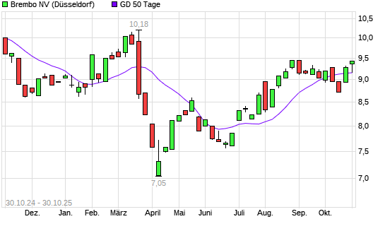Mit dem Anstieg auf 9,15 EUR hat die Brembo-Aktie am 29.10.2025 die 50-Tage-Linie nach oben gekreuzt.Die Brembo-Aktie befindet sich seit dem 08.08.2025 im langfristigen Aufwärtstrend ...weiterlesen
