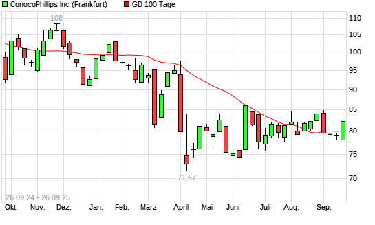 Mit dem Anstieg auf 82,36 EUR hat die ConocoPhillips-Aktie am 25.09.2025 die 100-Tage-Linie nach oben gekreuzt.Die ConocoPhillips-Aktie befindet sich seit dem 22.01.2025 im langfristigen Abwärtstrend ...weiterlesen