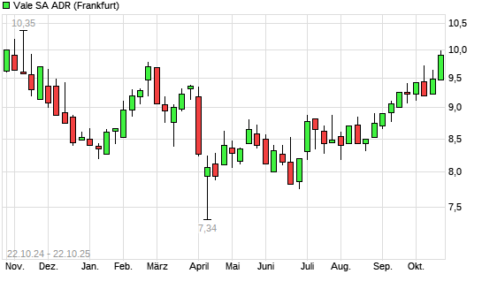 Mit dem Anstieg auf 9,70 EUR hat die Vale ADR-Aktie (ISIN US91912E1055) am 21.10.2025 ein neues 6-Monats-Hoch erreicht und damit den Kurs vom 06.10.2025 eingestellt.Die Vale ADR-Aktie befindet ...weiterlesen