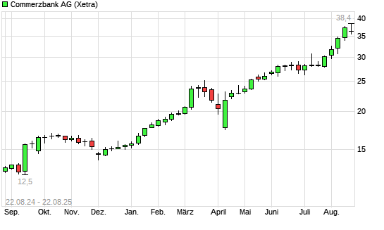 Mit dem Anstieg auf 37,70 EUR hat die Commerzbank-Aktie (ISIN DE000CBK1001) am 21.08.2025 ein neues 10-Jahres-Hoch erreicht und damit den Kurs vom 14.08.2025 eingestellt.Die Commerzbank-Aktie ...weiterlesen