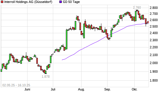 Mit dem Rücksetzer auf 2.540,00 EUR hat die INTERROLL HOLDINGS S-Aktie am 15.10.2025 die 50-Tage-Linie nach unten gekreuzt.Der Abstand zur 200-Tage-Linie beträgt aktuell +11,93%.