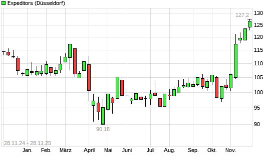 Mit dem Anstieg auf 126,45 EUR hat die Expeditors-Aktie (ISIN US3021301094) am 27.11.2025 ein neues All-Time-High erreicht und damit den Kurs vom 26.11.2025 eingestellt.Die Expeditors-Aktie ...weiterlesen