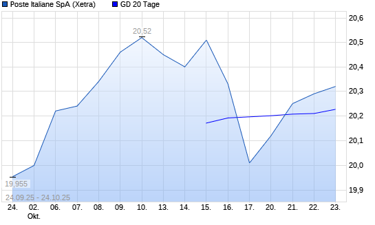 Mit dem Anstieg auf 20,22 EUR hat die Poste Italiane-Aktie am 23.10.2025 die 20-Tage-Linie nach oben gekreuzt.Die Poste Italiane-Aktie befindet sich seit dem 14.02.2024 im langfristigen Aufwärtstrend ...weiterlesen