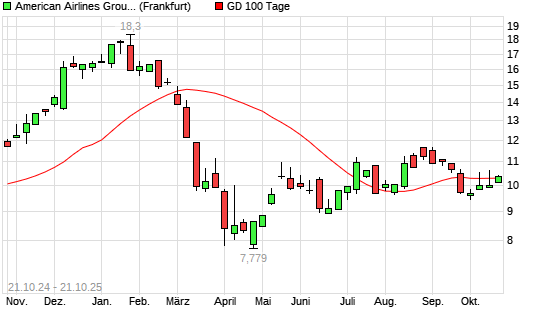 Mit dem Anstieg auf 10,42 EUR hat die American Airlines-Aktie am 20.10.2025 die 100-Tage-Linie nach oben gekreuzt.Die American Airlines-Aktie befindet sich seit dem 06.03.2025 im langfristigen ...weiterlesen