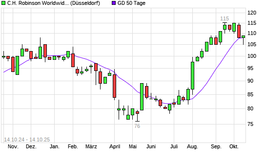 Mit dem Rücksetzer auf 108,00 EUR hat die C.H. Robinson Worldwide-Aktie am 13.10.2025 die 50-Tage-Linie nach unten gekreuzt.Die C.H. Robinson Worldwide-Aktie befindet sich seit dem 31.07.2025 ...weiterlesen
